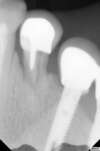 Le puit de vissage est bouché avec du composite couleur de la dent en céramique.